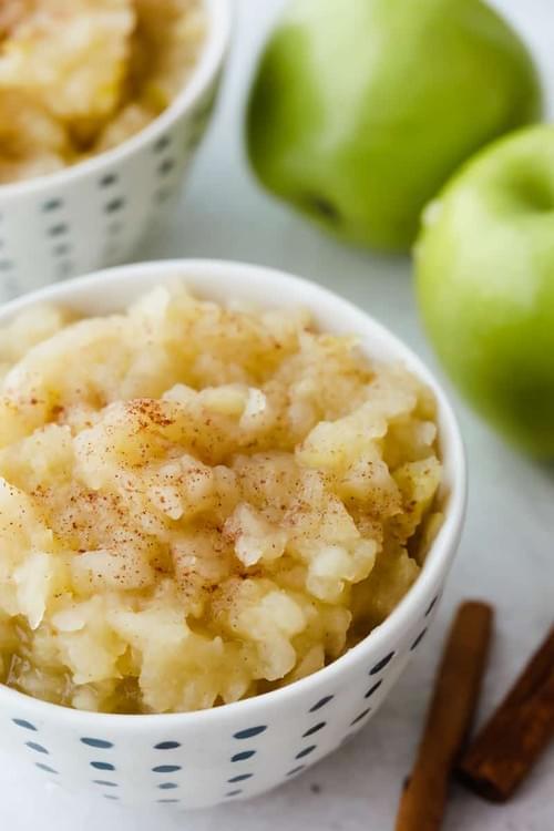 Granny smith & Honey crisp apples, cooked with a little sugar, white wine, cinnamon, nutmeg and left slightly chunky