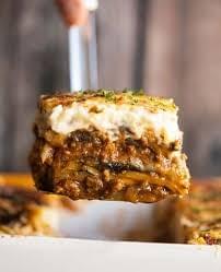 Layers of eggplant, zucchini, and potatoes. Meat sauce topped with a rich cheese sauce