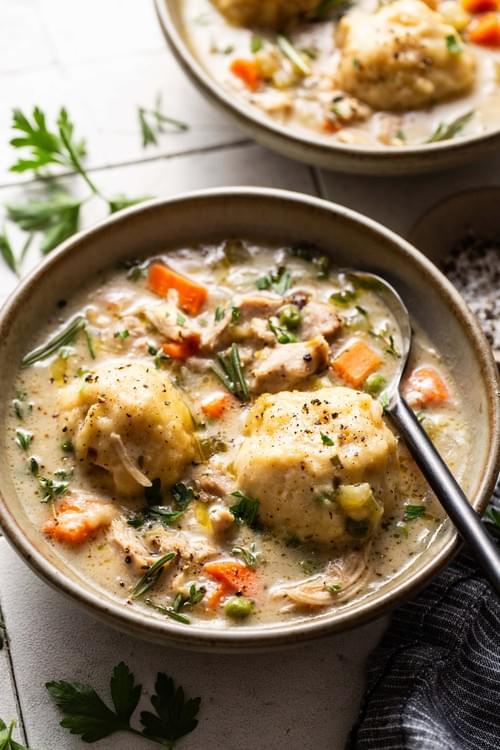 Tender pieces of chicken cooked in homemade chicken broth and veggies thicken with cream and homemade dumplings