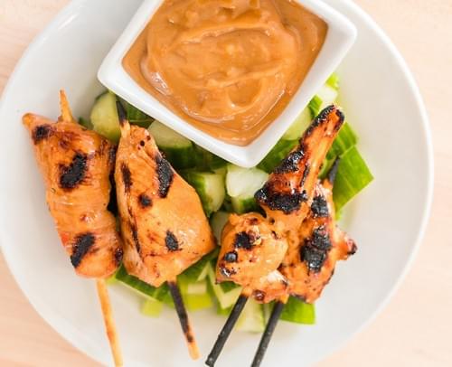 Marinated chicken skewers, grilled to perfection, on a bed of cucumber, and green onions, with a side of homemade peanut sauce