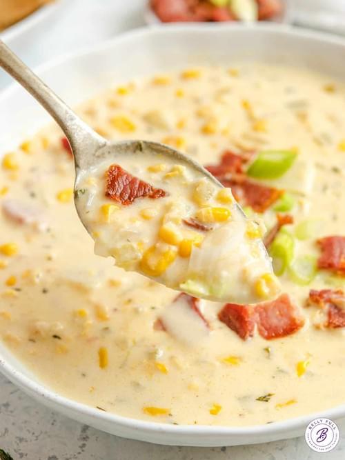 Corn chowder is a hearty, creamy soup made primarily from corn, potatoes, onions, and milk or cream, flavored with bacon.
