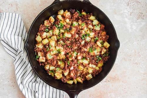 Corned beef hash is a hearty, traditional breakfast dish made by frying together chopped cooked corned beef, diced potatoes, and onions.
