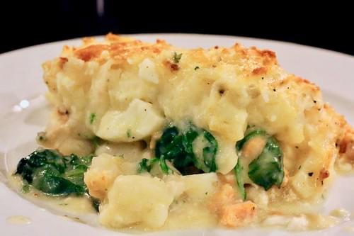Cod, salmon, and shrimp in a creamy sauce with a potato crust.