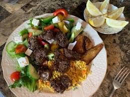 Greek Lamb with Feta, Tomato, and Calamata Olives served over rice pilaf