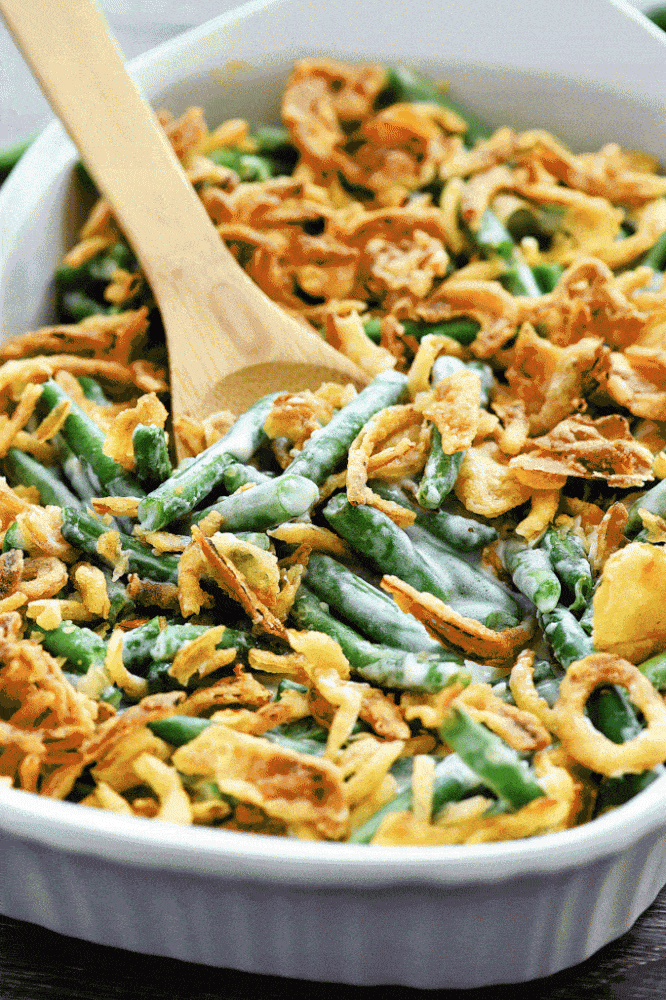 The classic holiday side made for everyday comfort food. Steamed green beans in mushroom sauce, topped with crispy onions.