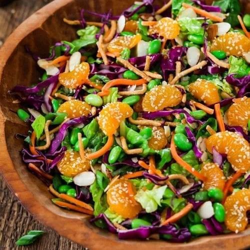 An Oriental salad with sesame dressing is a crunchy, vibrant dish featuring a base of cabbage and romaine lettuce topped with various vegetables, nuts, and a nutty sesame-soy vinaigrette