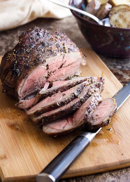 Boneless leg of lamb seasoned with garlic, rosemary and herbs