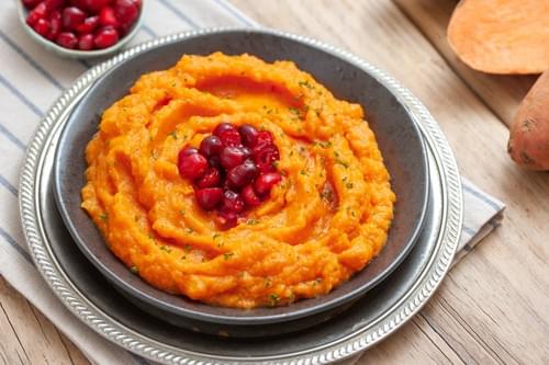Baked sweet potato mashed with butter, freshly squeezed orange juice, nutmeg, and a pinch of cinnamon
